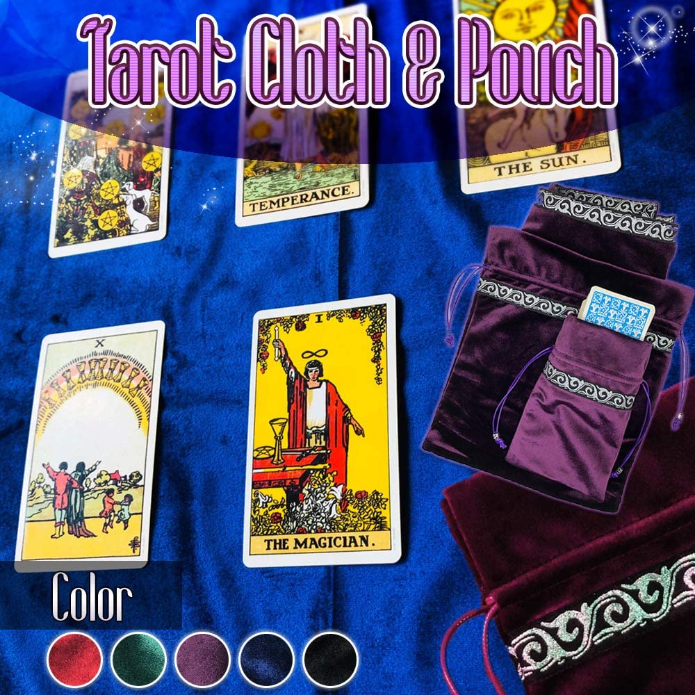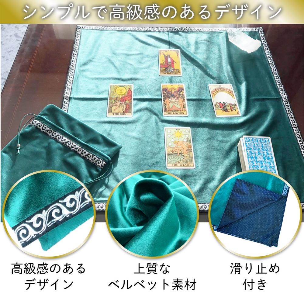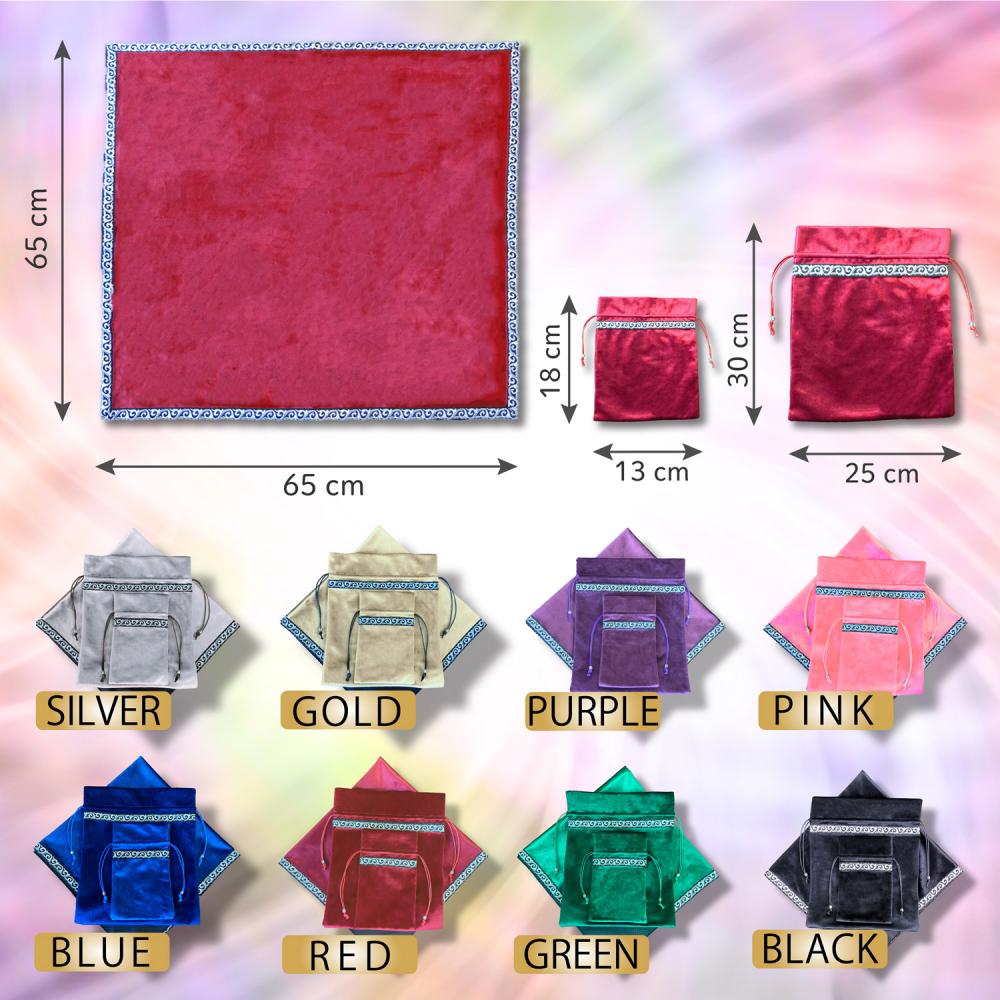 ・【内容】タロットクロス1枚、タロットポーチ1枚、タロットポーチ大の3点セット 、【サイズ】クロス:65×65 ポーチ:12×18 ポーチ大:30×25(単位cm)【素材】ベルベット 【カラー】紫、青、黒、緑、赤、金